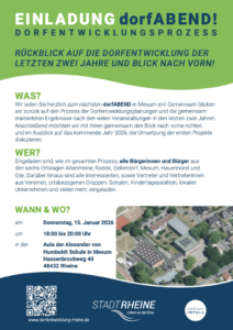 Alle Bürgerinnen und Bürger aus den sechs Ortslagen Altenrheine, Rodde, Gellendorf, Mesum, Hauenhorst und Elte sind herzlichst eingeladen am dritten dorfABEND teilzunehmen. Der dorfABEND ist die öffentliche Ausblickveranstaltung zur Umsetzung der Dorfentwicklungspläne für alle sechs Dörfer…